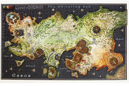 4D Cityscape now introduces the official puzzle guide for Game of Thrones Essos, based on the award winning HBO television series. This puzzle will guide players through the assembly of the map of Essos in a patented multi-layer design. The first layer is a 1000+ pieces jigsaw puzzle that will teach you all about the various locations and regions of Essos. The second layer is an artistic 200+ pieces jigsaw puzzle that replicates the current landscape based on the famous introduction of the television series. The third layer adds the 3D miniature replicas models that you insert into the puzzle, which include famous cities and castles such as Braavos, Pentos, Meereen, Valyria, Astapor and many more! In addition, the puzzle comes with an information booklet that teaches you everything you need to know about Westeros, including over 45 flags to mark famous landmarks, 10 sigils to mark the Houses, and 3 battle markers to learn the locations of three major battles. Bonus items includes a miniature set of the Dragon Eggs. Ages 13+. The fully assembled product measures 30 x 18 x 2 inches.